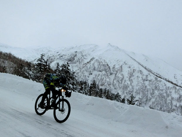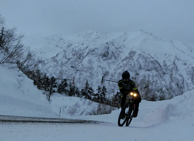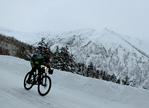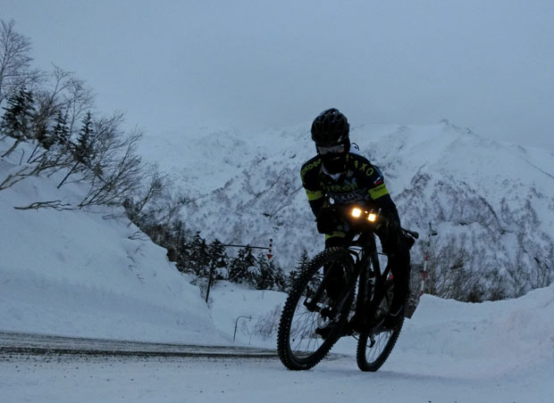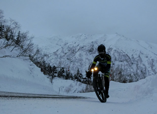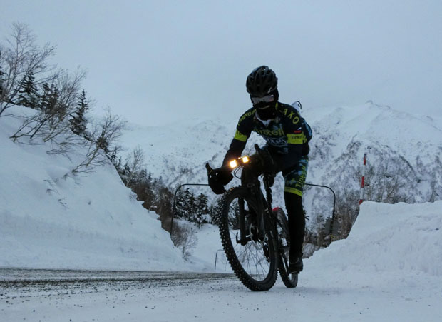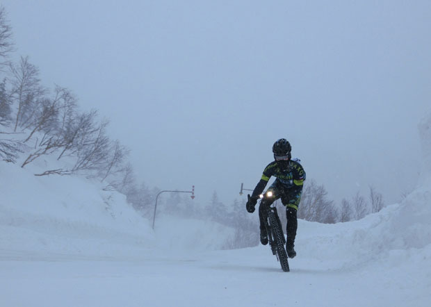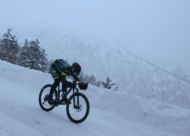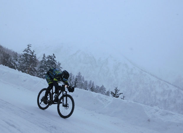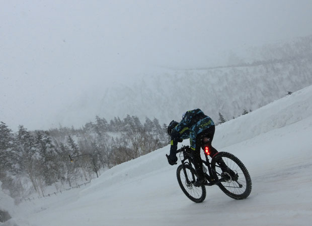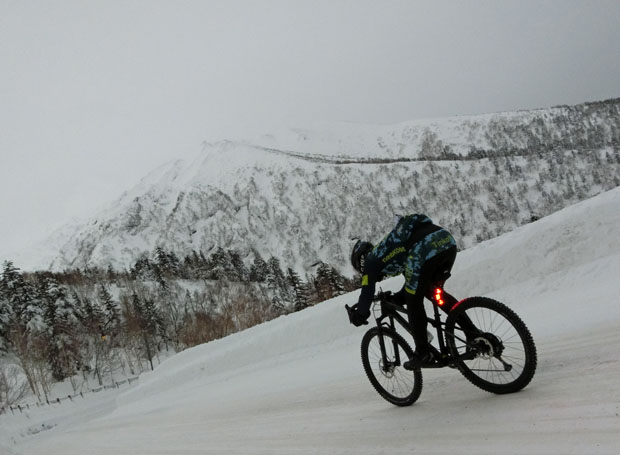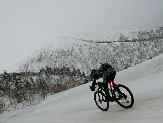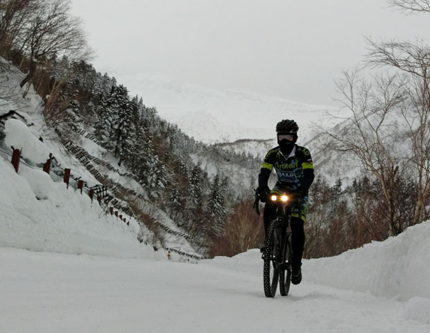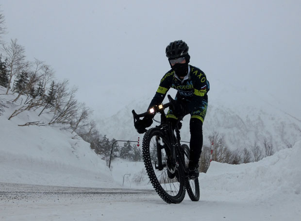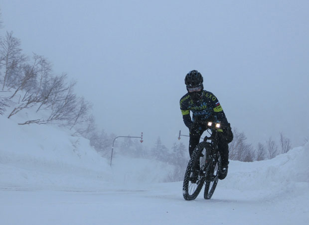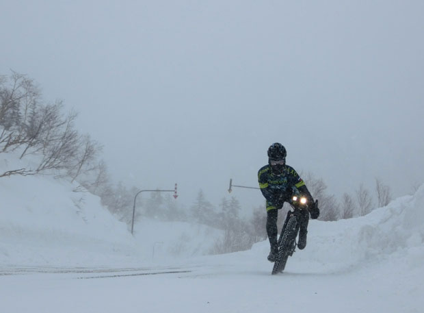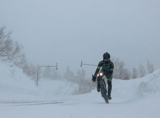 It was a hot day because a low pressure was approaching. The temperature was higher at high altitudes because of a micro-foehn. The road surface was covered with compacted snow but a lot of antiskid agents was scattered. After the interval training at the summit, he descended at 1090m of altitude. It began to snow. He climbed up to the summit and did the interval training there. He descended again and climbed again. During the final climb to the summit, south-east winds were getting stronger and the visibility went down because of a ground blizzard.