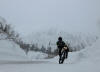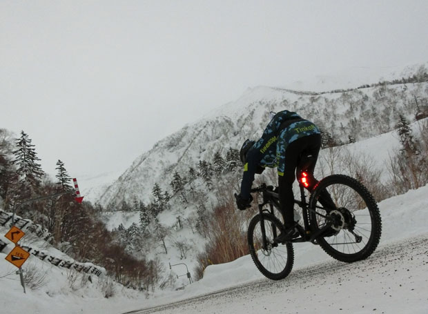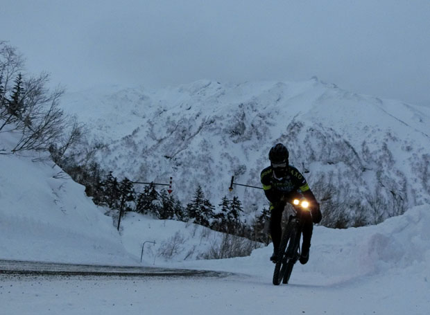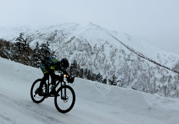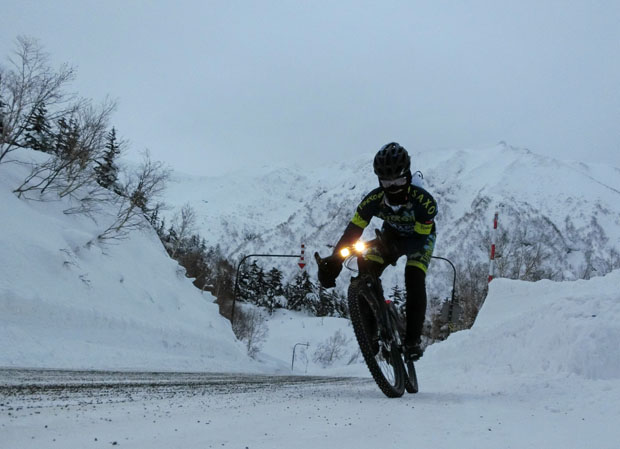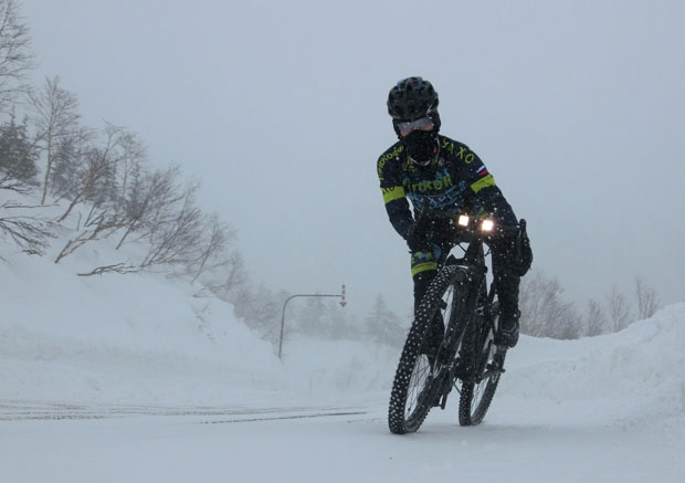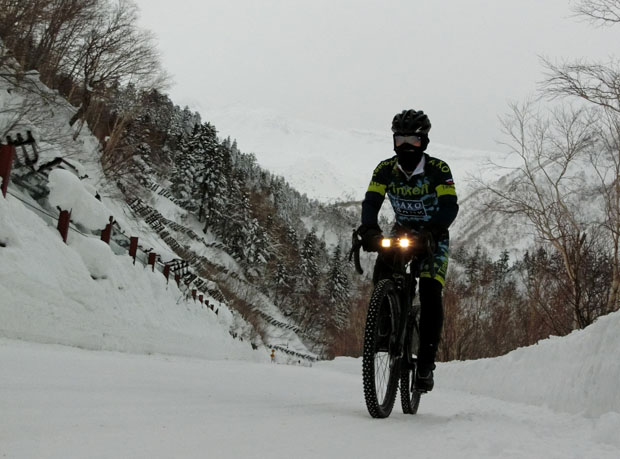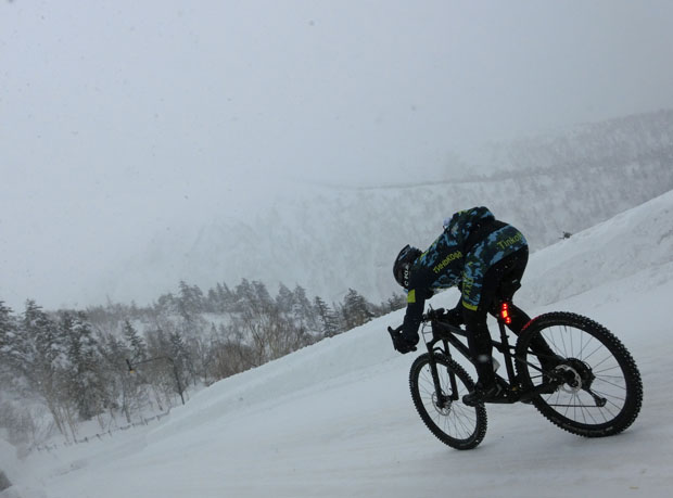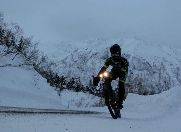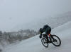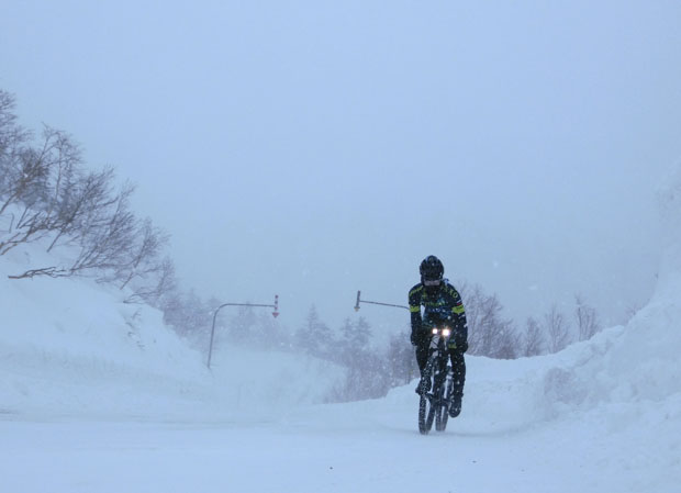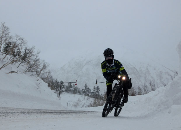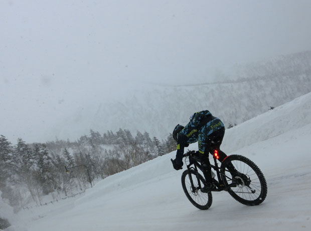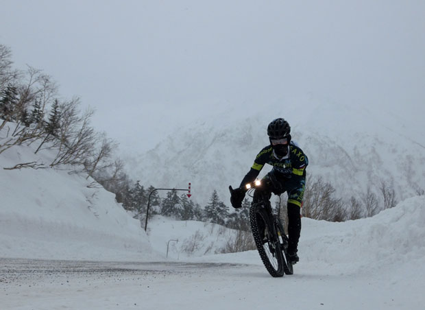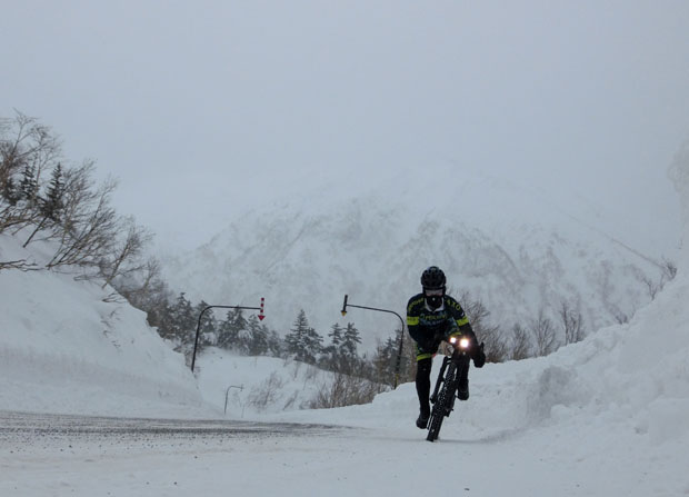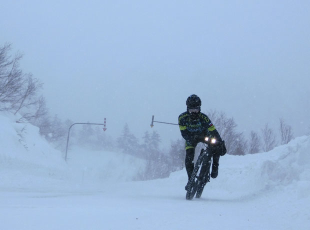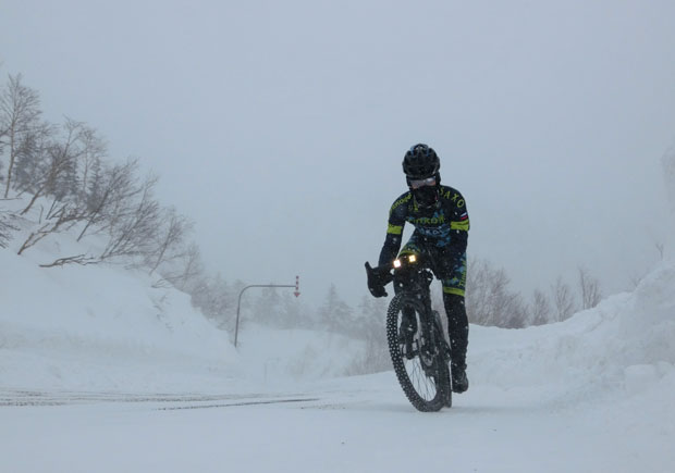 It was a hot day because a low pressure was approaching. The temperature was higher at high altitudes because of a micro-foehn. The road surface was covered with compacted snow but a lot of antiskid agents was scattered. After the interval training at the summit, he descended at 1090m of altitude. It began to snow. He climbed up to the summit and did the interval training there. He descended again and climbed again. During the final climb to the summit, south-east winds were getting stronger and the visibility went down because of a ground blizzard.